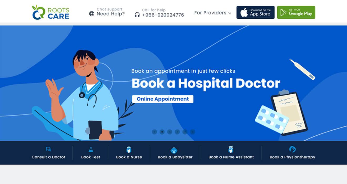 Webmaa collaborated with RootsCare, a trusted name in home-based healthcare services, to build a robust digital platform that connects patients with qualified caregivers, nurses, physiotherapists, and medical attendants from the comfort of their homes.